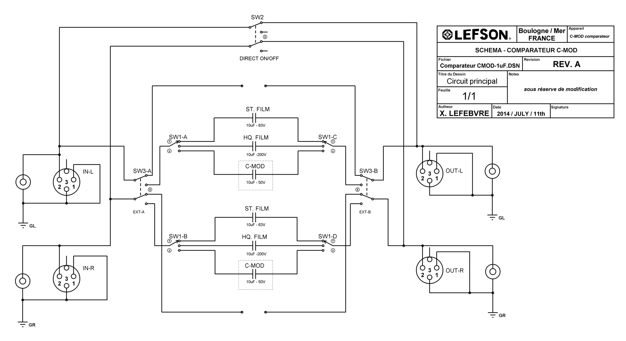 La « LEFSON - Comparative Box » est un boîtier comparateur stéréo pour condensateurs de liaison. Ce dernier n'est constitué que d'embases, de commutateurs rotatifs et à levier. Ci-dessous, une image du boîtier comparateur 1µF